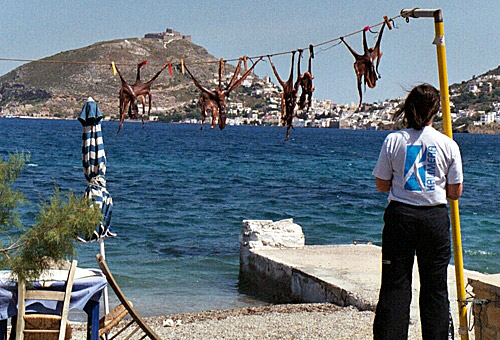 Fem (!) versioner av Inkfisk på tork och en Kalimerian. Alindastranden på Leros.