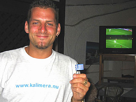 Jens på Fatman bar, firar med flaggan i hand! - Santorini