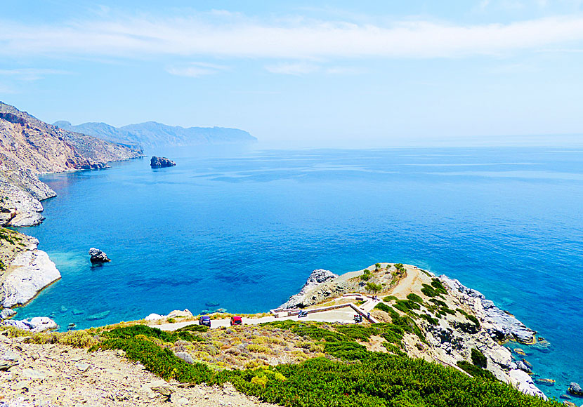 Vattnet är kristallklart och det finns mycket att se runt klipporna, så glöm inte snorkel och cyklop. Skugga är en bristvara och det blir ruggigt hett om skallen efter en stund. Men vattnet är nära och snart är det glömt. Om du simmar ut en liten bit och vänder blicken upp mot bergen till höger ser du klostret Panagia Hozoviotissa. En syn som kan göra vem som helst religiös.