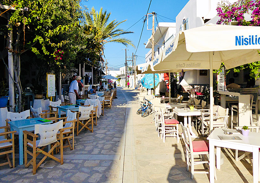 Hamnen är liten men livlig: båtar till och från Paros kommer och går, segelbåtar och fiskebåtar trängs om vartannat, turister och bybor sitter på de strategiskt belägna tavernorna varifrån man har fin utsikt över Paros.