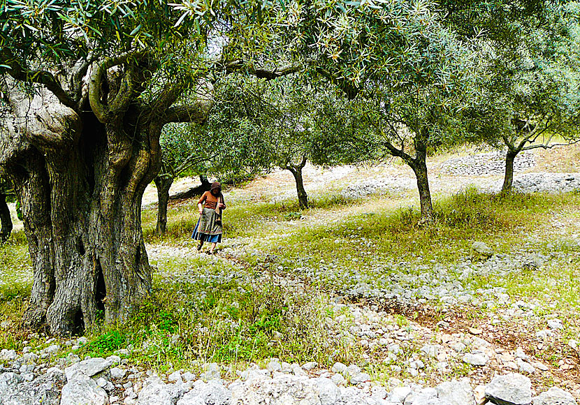 Vandra genom gamla olivlundar på Lefkas.