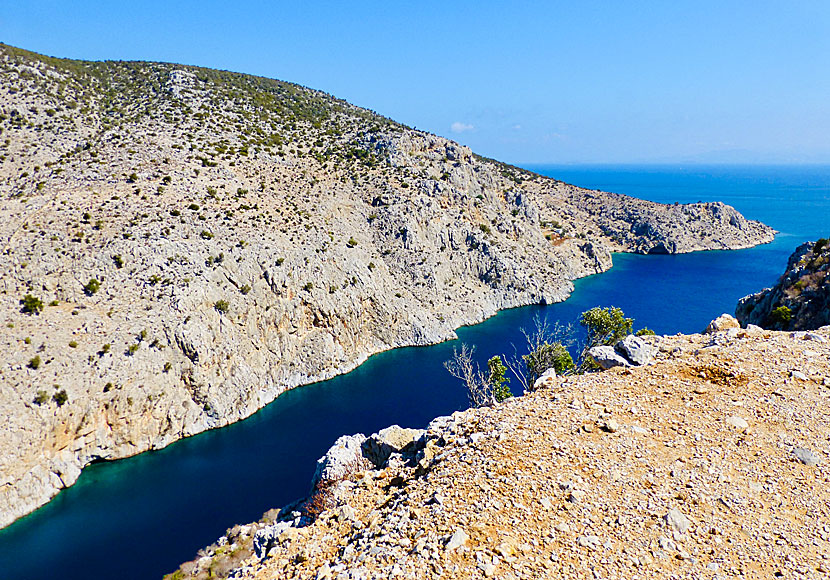 Vyn över Rina, fjorden och Vathydalen är alltså måttlöst vacker, och utan tvekan en av Kalymnos mest fotograferade plats. Ovanför dalen, längs vägen till Pothia, kan man stanna och förstummas av utsikten, och ta en och annan bild. Har man tur är en segelbåt på väg in i fjorden, och tavlan blir då komplett.