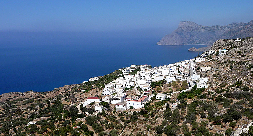 Vi stannade ganska länge i Lefkos där vi åt vi en mycket god lunch på Taverna Blue Sea, och gick runt och fotograferade de många fina sandstränderna, och den lilla halvön med stenrösen. Sedan fortsatte vi till Mesochori som vi tycker är den vackrast belägna byn på Karpathos efter Olympos.