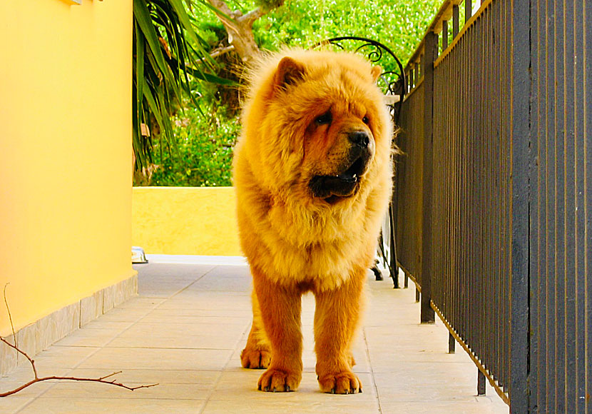 Den här lejonliknande hunden bodde i ett hus nära vårt hotell i Korissia. |