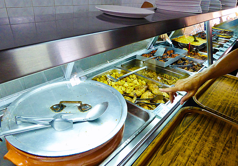 Tavernan serverar mycket god mat. När man ska beställa går man in i köket och väljer bland grytor och kastruller. Det svåra är att bestämma vad man ska äta, för det finns massor att välja på.