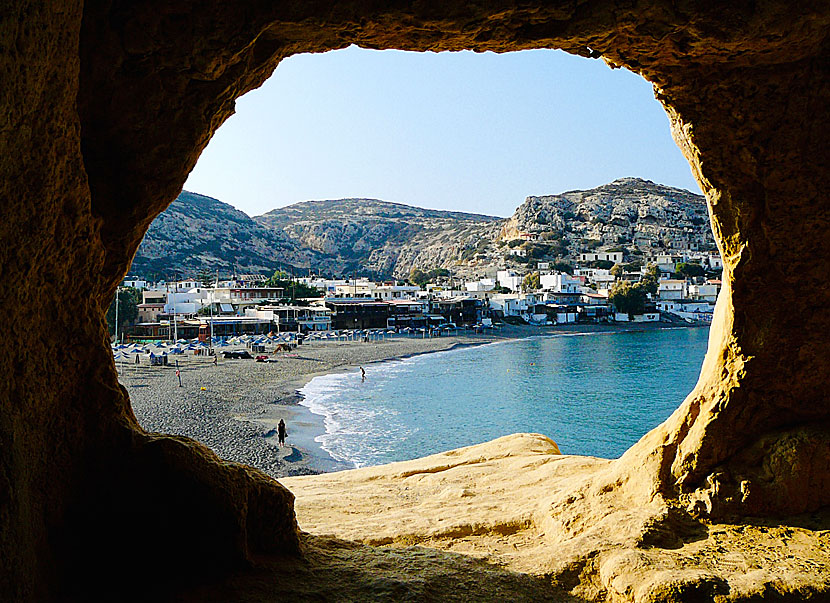 Stranden i Agia Galini. Byn med samma namn ligger uppe på kullen. |