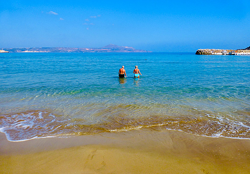 Bortre delen av stranden i Almyrida. Plaka ligger på kullen ovanför stranden. |