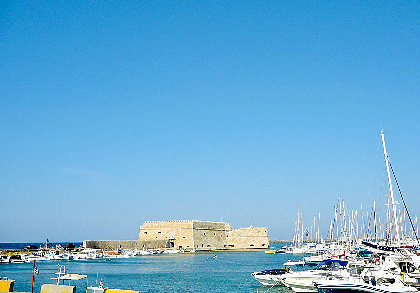 Det mesta i Heraklion kretsar sig kring hamnen, hamnpromenaden och kvarteren kring gågatan 25:e Avgoustou. 25:e Augustigatan - som vi säger på svenska - utgår från den Venetianska hamnen och fortet Koules som dominerar hamninloppet. Fortet - som är från 1500-talet - används idag för konstutställningar och konserter. Det är öppet varje dag utom måndagar mellan 08:30 och 19:00.