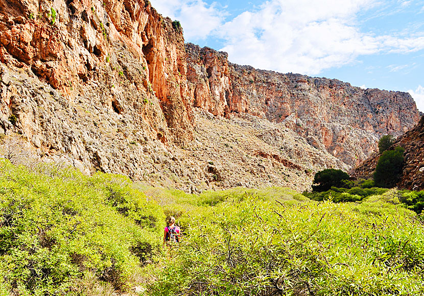 byn Kato Zakros till höger. Ravinen har fått sitt namn efter de minoiska grottgravar som man har funnit längs ravinens klippbranter. Man måste inte gå hela ravinen, det räcker att gå någon timme åt vardera hållet för att få njuta av vacker natur, branta klippsidor och dödlig tystnad. Vandringen är enkel och passar även dig som i vanliga fall inte brukar vandra.