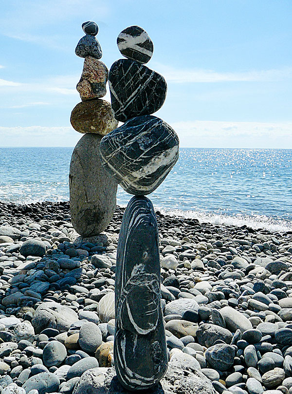 Den lilla huvudgatan slutar vid stranden som breder ut sig åt två håll. Stranden består av klappersten och är så lång att man knappt kan se slutet av den. En del stenar är jättestora och används till att bygga konstverk. Jag har fler gånger stått som förstenad (!) och sett nakna stenbyggare kämpa med sina konstverk. Killen som byggde det kämpade i flera timmar för att få stenarna att ligga kvar. Inte lätt kan jag lova. |