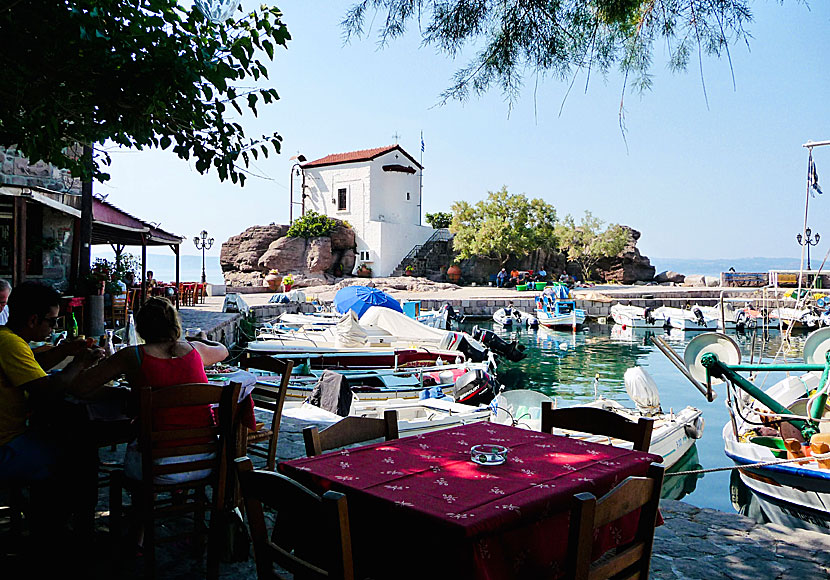 Skala Sikaminias är en av de gulligaste fiskebyar jag har sett och det är fullt förståeligt att den är porträtterad på många vykort. Runt den näpna hamnen finns två tre oemotståndliga tavernor. Även om man är mätt kan man inte låta bli att sätta sig på någon av tavernorna, beställa in något att äta eller dricka och njuta av den lilla dockskåpshamnen.