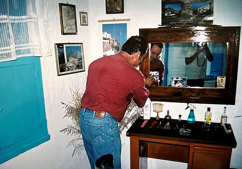 På den tiden tog vi alltid med kopior på bilder vi hade tagit på tidigare resor för att ge till greker vi hade träffat under åren. Så när vi i september 2001 återvände till Nisyros, tillsammans med Camillas mamma och pappa, hade vi med oss bilderna ni ser här ovanför och lämnade över dem till frisören. Gissa om han blev glad! Han satte genast upp bilderna på spegeln inne i frisörsalongen.