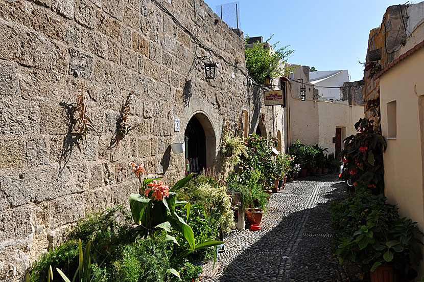 När jag är på Rhodos bor jag alltid på Kristinas Rooms som ligger i de södra delarna av Rhodos gamla stad. Jag älskar den delen av staden, dels för att där fortfarande bor greker, dels för att det inte finns några souveniraffärer och inte heller några restauranger med jobbiga inkastare, dels för att det är så fascinerande och fantasieggande att planlöst strosa runt i alla gamla vackra gränder. Ibland går jag ner i vallgraven och njuter av den oerhört pampiga ringmuren. Sedan några år tillbaka kan man även gå uppe på ringmuren, och det är ännu häftigare än att gå nere i vallgraven. Vandringen börjar vid Stormästarens palats, där man även köper biljetter, och den slutar nära Kokkini Porta, där Kristinas Rooms ligger där.