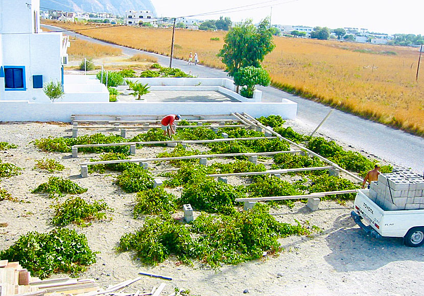 När vi skulle gifta oss på Santorini år 2003 bodde vi på Honeymoon Beach Hotel i Perivolos. Mellan husen växte det vindruvor av sorten Assyrtiko. Några dagar innan bröllopet kom det några hantverkare som skulle bygga en dansbana och en scen inför bröllopet. Efter bröllopet kom hantverkarna tillbaka och återställde den lilla vinodlingen.
