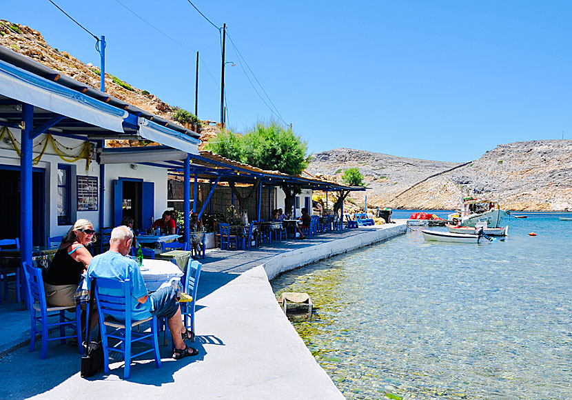 Här sitter man gärna länge och njuter av stillhet och god mat. Den lilla stranden är inte den bästa på Sifnos, men efter en långlunch på någon av strandtavernorna sitter en simtur inte dumt.