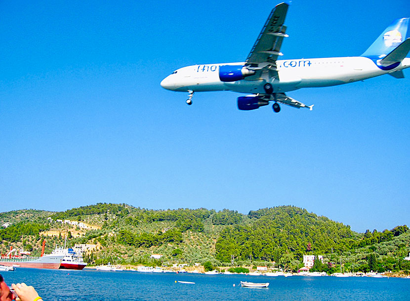 Att landa på Skiathos är ett litet äventyr. Landningsbanan är kort. Väldigt kort. 1 570 meter för att vara exakt. Planen stryker över vattnet nära hamnen innan de landar med ett dånande muller. För att hinna få stopp på planen innan landningsbanan tar slut är det full broms som gäller.