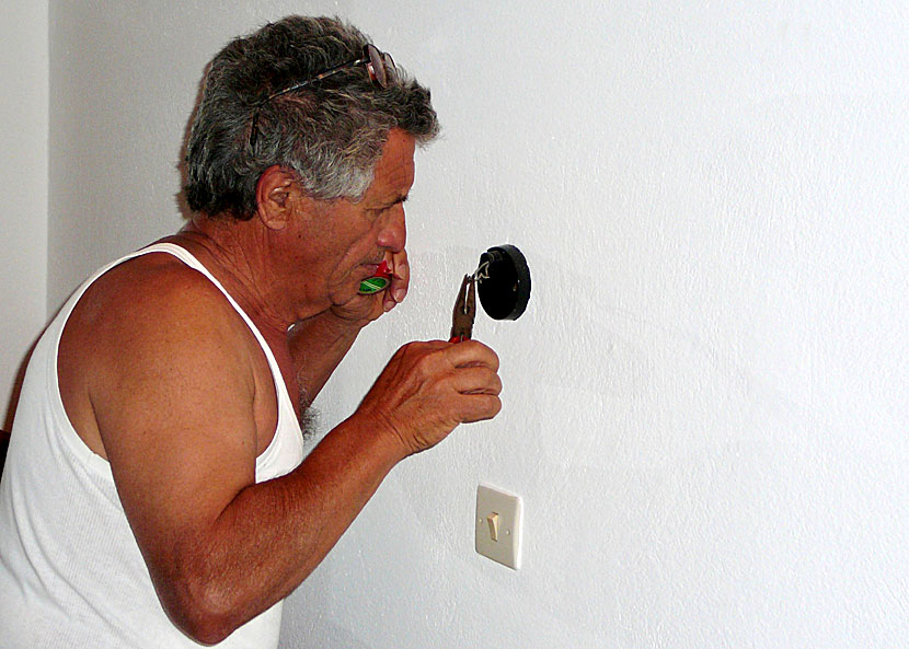 Den enda rumsuthyrare som fanns i hamnen ställde den klassiska frågan: Rooms? Searching for rooms? Vi svarade med ett glatt YES! Han såg perplex ut. Oklart varför. Tyst blev han i alla fall. Vi kände att vi var tvungna att ta initiativet och ställde den lika klassiska öluffarfrågan: Where is it and what is the price? Ingen av frågorna fick något svar. Han mumlade något. Vände sig till sin kompis, pratade på grekiska, mumlade igen och tittade ut över havet. Då gick vi vidare. |