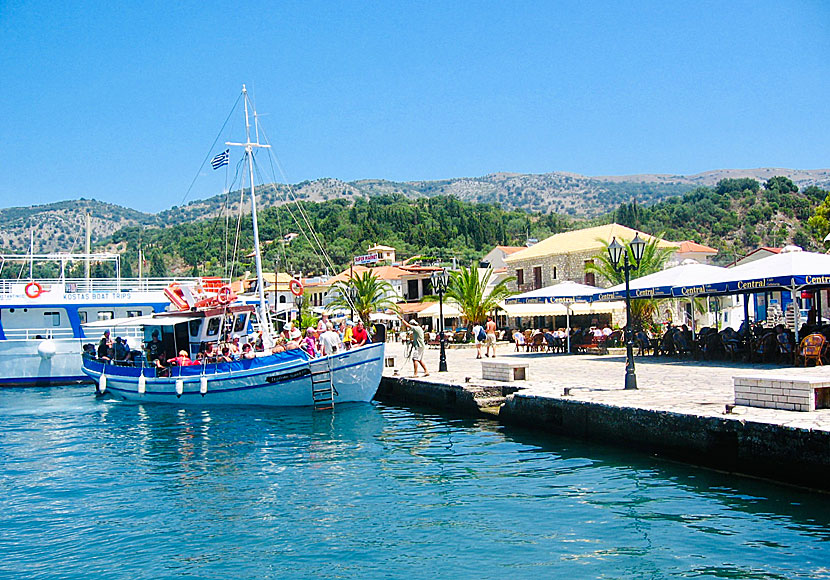 Utflyktsbåt i den mysiga hamnen i Sivota.