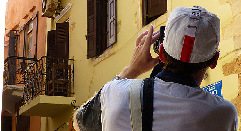 Den mest fotograferade gränden i Chania, eller kanske rent av på hela Kreta, är Odos Angeloy. Det är ett stort nöje att äta lunch på Taverna Kalderími och se alla som stannar för att ta en bild. Jag brukar roa mig med att ta bilder av dem som tar bilder. Det är knappt att jag hinner njuta av dem goda maten. Här kommer några av dessa bilder. Längst ned på sidan finns en länk till en bild på själva gränden. Vad är det som alla fotograferar? :-)