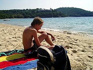 Efter ett tag börjar folk komma, och till vår stora förvåning är de nakna! Banana Beach visar sig vara en plats där nudisterna håller till, så efter ungefär en timme där så byter vi till Koukounaries. Även den stranden är helt underbar, även om Banana på något sätt var finare. Vi noterar att det är ganska mycket getingar på Koukonaries,