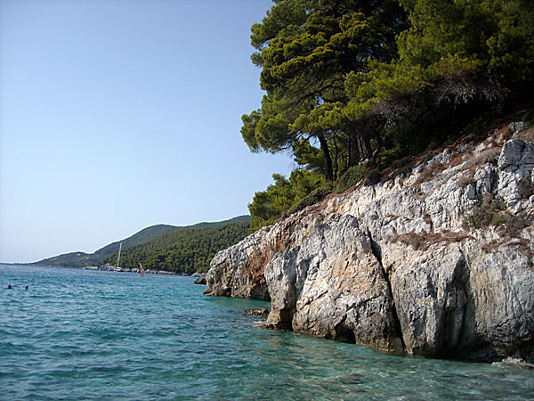 Kommer fram till en annan strand . Åh det är ju Milia vi kommer till, slänger ner ryggan och kliver ner från en stor sten. Här lägger vi oss nära en klippa i början av stranden, vattnet nästan killar oss under fötterna. Stannar till kl 17 :15. Vi vill ej hem men bussen väntar på oss så det är nog bäst. Får en känsla av att det var kanske där dom satt uppe på klippan i filmen Mamma Mia. En vacker klippa som många tar bilder på.