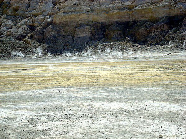 En fantastisk utsikt över vulkanen. Visst ville vi se vulkanen lite närmare också, så vi tog den slingriga vägen ner en tidig morgon för att slippa alla turister som kommer från Kos mitt på dagen. Det blir också fruktansvärt varmt när solen står som högst. Det rök, pyste och luktade svavel från hål ur jorden.