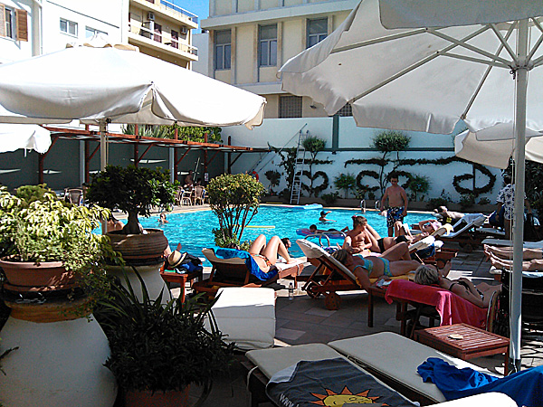 Hotellet ligger mitt i smeten mellan de båda stränderna, och det finns en stor pool, bra käk (som inte var hotelldyrt) och trevlig personal gjorde att timmarna bara försvann. Snart stod vi på kajen för att gå ombord på den jättelika Blue Star-färjan, och efter bara två timmar kom vi fram till Tilos.