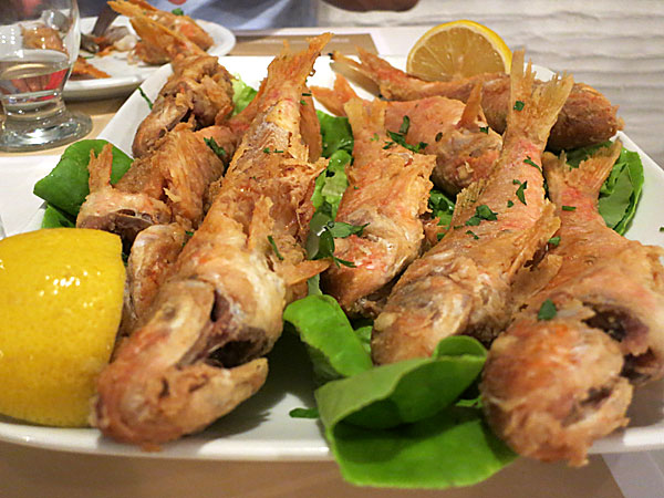 Bästa restaurangen: Ammos som har många bord och är fullsatt varje kväll. Vi äter musslor och pasta med skaldjur och bäst av allt, friterade red mullet. Fisken heter mulle på svenska och ser ut som stora guldfiskar - den godaste fisk vi äter under denna resa. Vi tar bussen till Chora som har två stora stränder, men vi har inte badkläder med oss. Nöjer oss med att strosa omkring i värmen och fika i skugga. Landskapet på Andros är dramatiskt och grönt, inte alls flackt som jag av någon anledning har fått för mig. Förmodligen för att det inte finns någon öguide och jag varje gång jag läst om Andros på datorn glömt vad jag läst Den återkommande frågan på årets öluff har varit: "Varför skulle vi egentligen åka till Andros?" Så läser vi åter om ön och säger: "Jamen, det är klart vi ska åka dit!" Några saker skiljer årets resa och öluff mot våra tidigare Greklandsresor. Vi hör inte skandinaviska språk särskilt ofta. Jag får inte med familjen på en enda längre vandring, men både jag och dottern joggar flitigt. Vi äter lunch ute oftare, ibland gyros, ofta smårätter. Årets upptäckt blir grillad paprika som vi ofta tar förutom den gamla favoriten friterad zucchini, saganaki, ostbollar och andra keftedes (bollar). Det godaste jag äter är fyllda zucchiniblommor. När vi gör egen grekisk sallad lägger vi till kapris som vi köper i lösvikt. Gott! Retsinan lyser med sin frånvaro under denna resa. Inte en enda restaurang vi besöker har retsina på menyn - för att vi besöker öar med mest grekiska turister? Affärerna har sällan retsina i sitt sortiment. När jag skriver märker jag att jag minns Tinos bäst