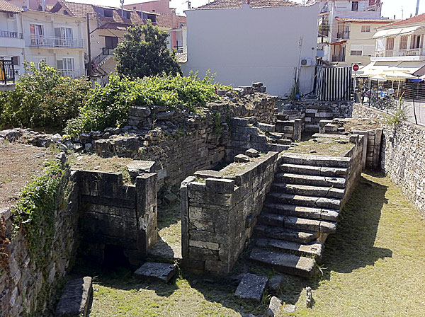 Antika lämningar finns överallt i centrala Limenas. Olga apartments är huset med vita balkongräcken till vänster i bild. Till höger anas affärs-/gågatan. Vårt första och bestående intryck av Thassos detta år var att det inte syntes något spår av någon grekisk kris, snarare tvärtom! Thassos var mer levande än någonsin! Då vi nu hade bil under alla 12 dagar vi var på ön så kändes det mindre tvunget att åka iväg varje dag för att se något nytt. Många dagar tillbringades på en för oss tidigare ratad strand; den i bortre änden av Limenas, på väg ut mot Evreokastro och ett par hundra meter från hotellet. |